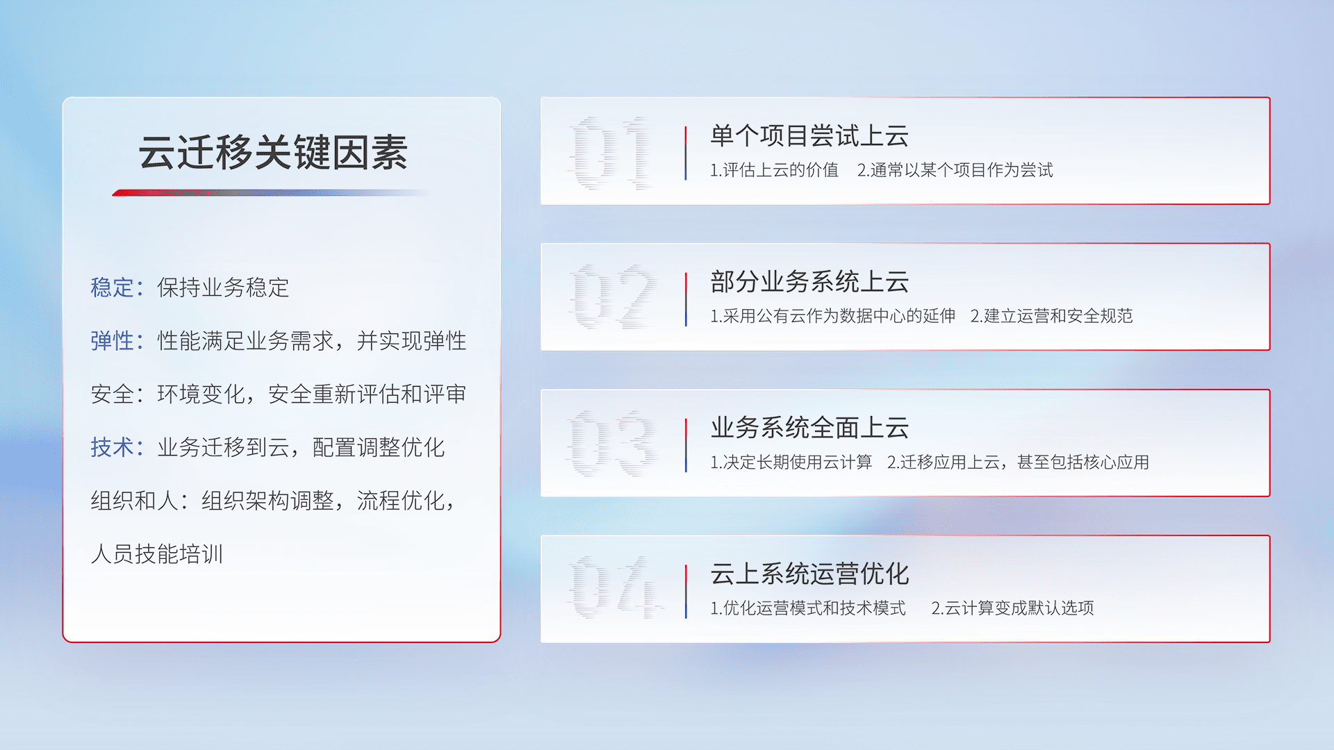 结合实际业务,,从规划设计、、云平台选型、、云原生改造、、数据迁移、、集成交付,,迁移全过程为客户识别最佳上云路径,,,做好风险识别管理,,,,设计网络架构、、、、身份权限、、安全审计合规、、操作审计、、、、日志审计、、、监控告警策略、、、多站点容灾设计等,,对云上基础设施进行整体规划,,,提升IT治理水平,,,,以满足弹性、、、、高可用、、高性能的需求。。。。