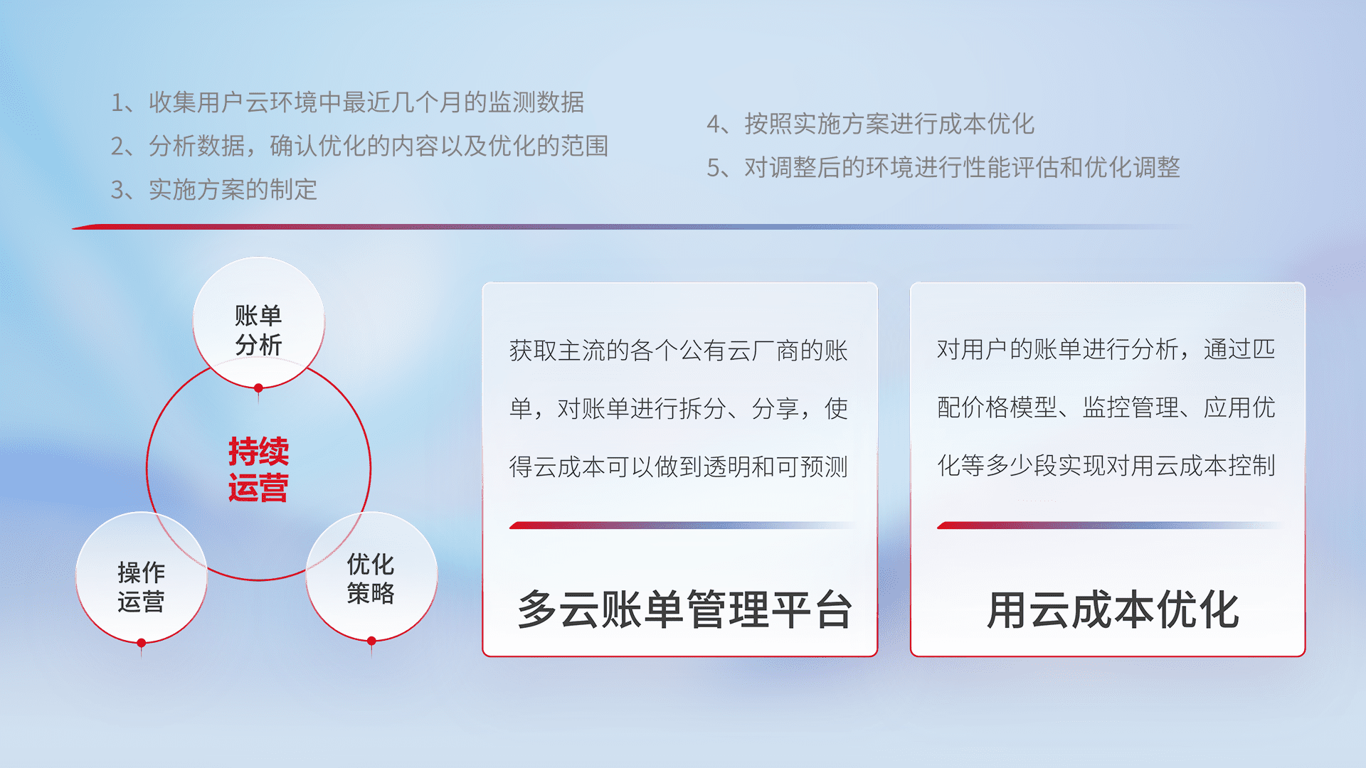 通过多云纳管,,,,以统一的资源数据模型把客户的云资源进行抽象和封装,,进而实现对多云资源的统一操作,,,保障云资源管理的可靠性、、、、稳定性与可用性。。。。量身定制化运维内容,,,,配置、、、开发运维、、补丁管理、、、备份、、、监控、、、认证和访问管理、、、、审计和日常巡检等,,,保障在用云过程中的可靠度,,,稳定度以及高可用率。。。